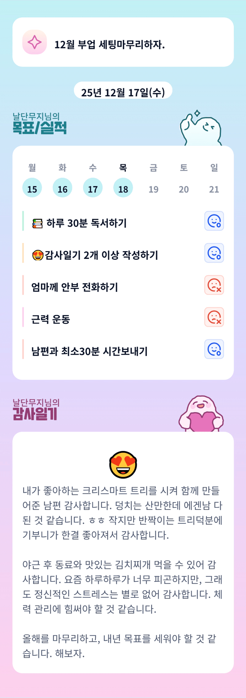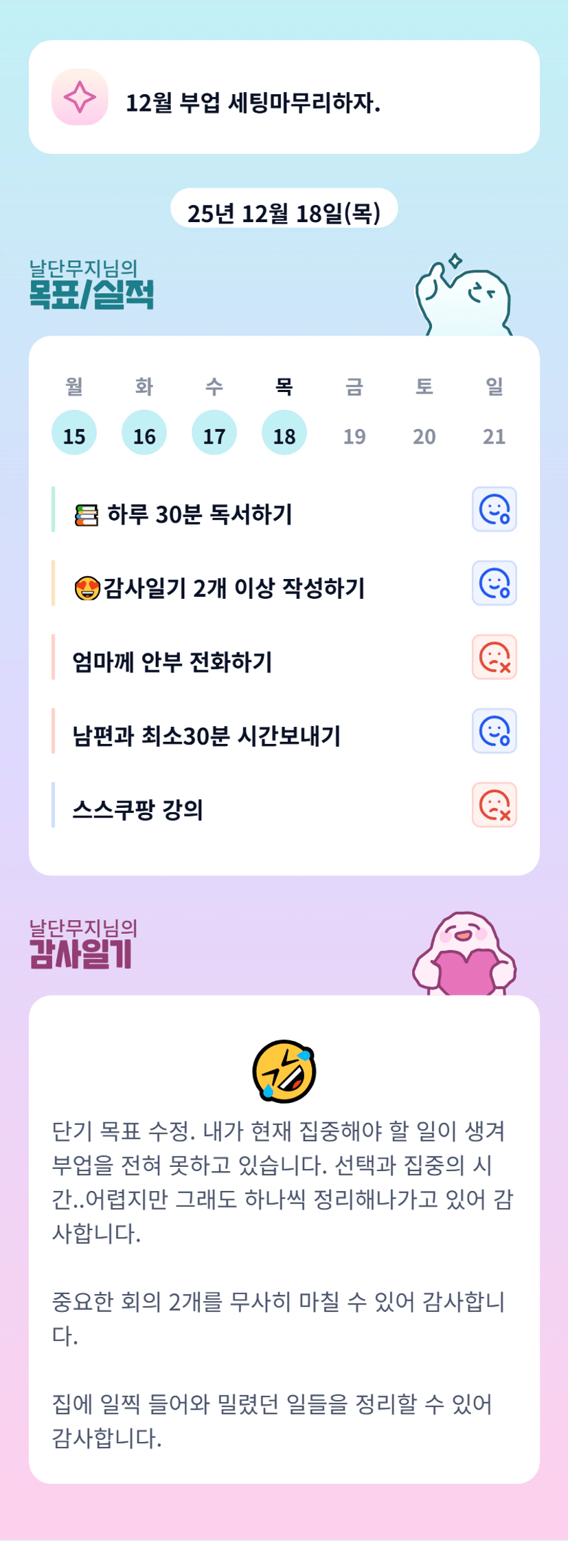 꾸준함이 중요하다. 부정적인 생각이 몰아닥칠 때 독서와 운동을 한다.