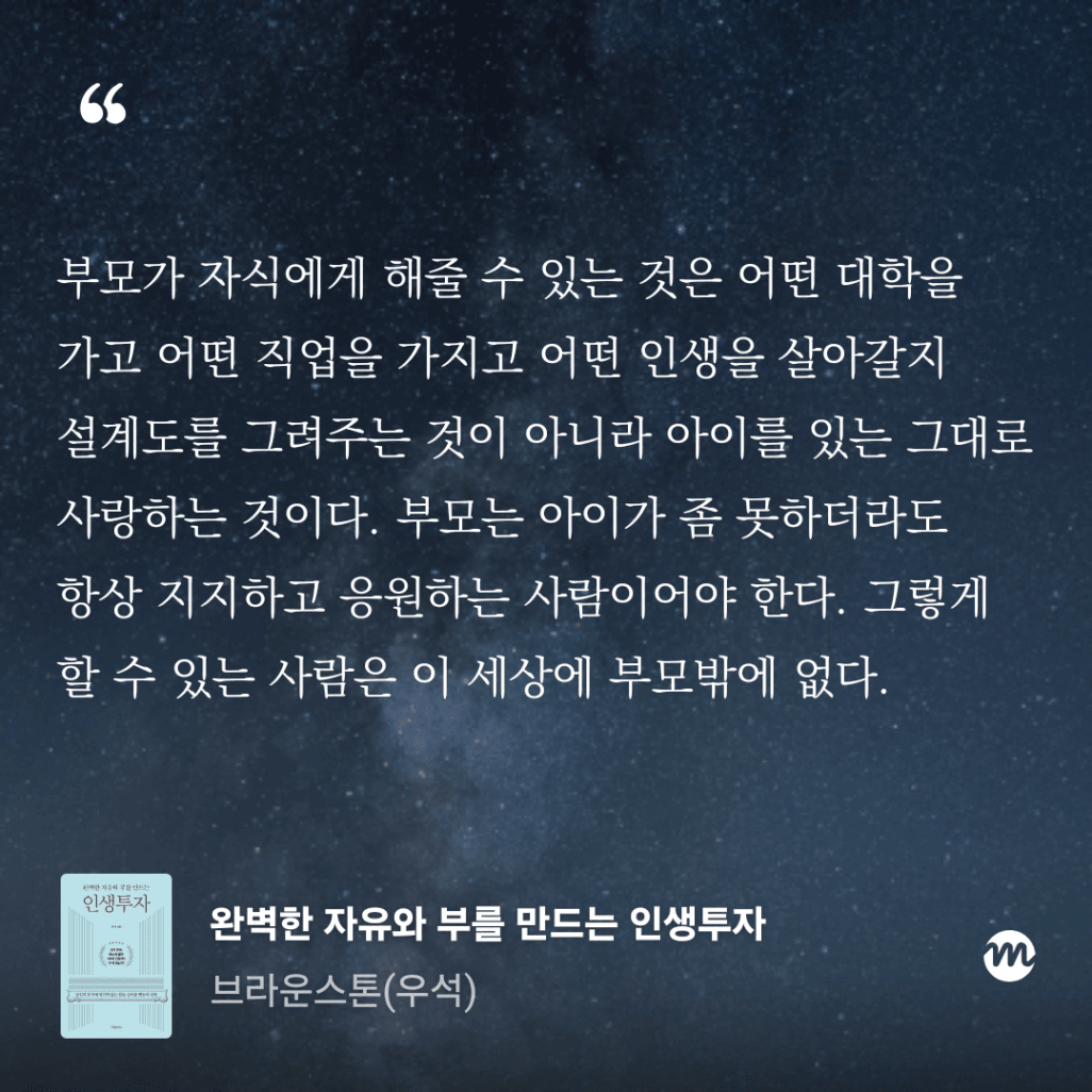‘부모가 자식에게 해줄 수 있는 것은 어떤 대학을 가고 어떤 직업을 가지고 어떤 인생을 살아갈지 설계도를 그려주는 것이 아니라 아이를 있는 그대로 사랑하는 것이다. 부모는 아이가 좀 못하더라도 항상 지지하고 응원하는 사람이어야 한다. 그렇게 할 수 있는 사람은 이 세상에 부모밖에 없다.’