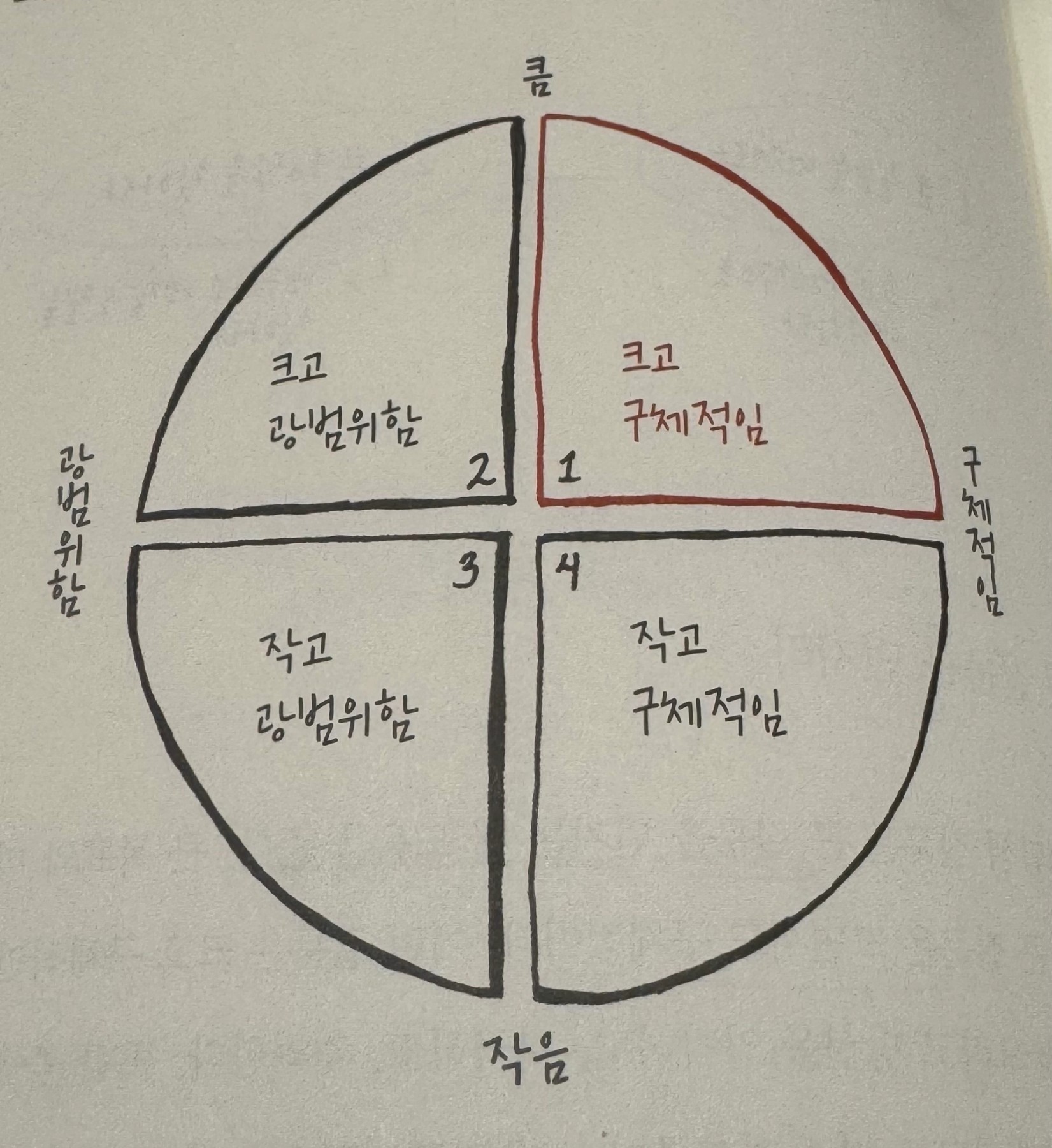 4사분면. 작고 구체적 : 올해 안으로 매출을 5퍼센트 높이려면 어떻게 해야하는가?