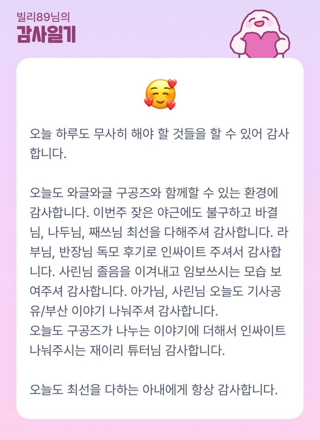 구공즈에게 항상 든든한 빌부님 되어주셔서 감사해요! 오늘도 남은 시간 임보 달려보시쥬