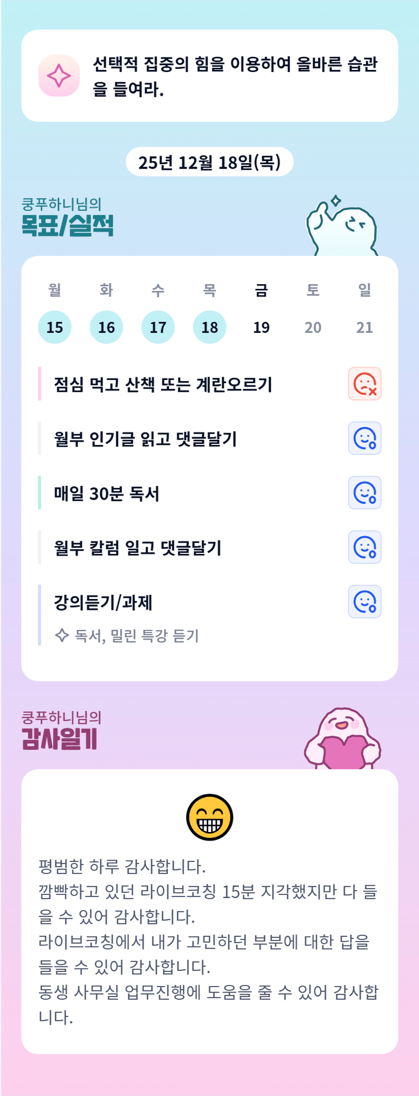 고민의 답을 들을수 있었던 라이브 코칭! 넘넘 좋은 시간 이셨을거 같아용 ! ㅎㅎ 고생하셨습니다 쿵푸하니님 ~!