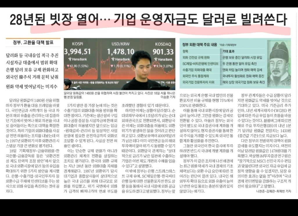 환율 1480원까지. 대국민적으로 해외투자가 늘어나 외환유출은 심한데, 외부 자본은 그에 비해 덜 들어와서 원화가치가 크게 감소. 이제야 정부가 외환유입의 길을 터줌. 그만큼 고환율이 심각하기도 함.