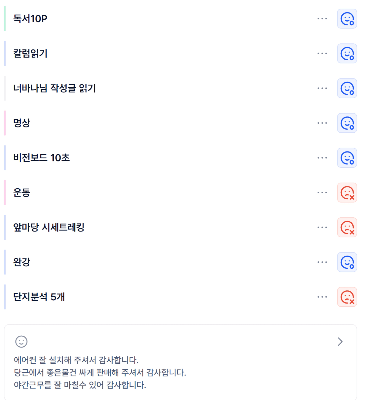 나는 건강한 사람이다.나는 부단히 노력하는 성실한 사람이다.나는 2025년 앞마당 10개를 만든다.나는 2026년 3호기 투자한다.나는 2028년 4호기 투자하고, 순자산 15억 달성한다.나는 2030년 5호기 투자한다.꾸준함은 성공의 최고 덕목이다. 나는 꾸준히해서 2035년 30억 부자가 된다.나 우가행은 해내는 사람이다.나는 한다.나는 해낸다.나는 반드시 된다.