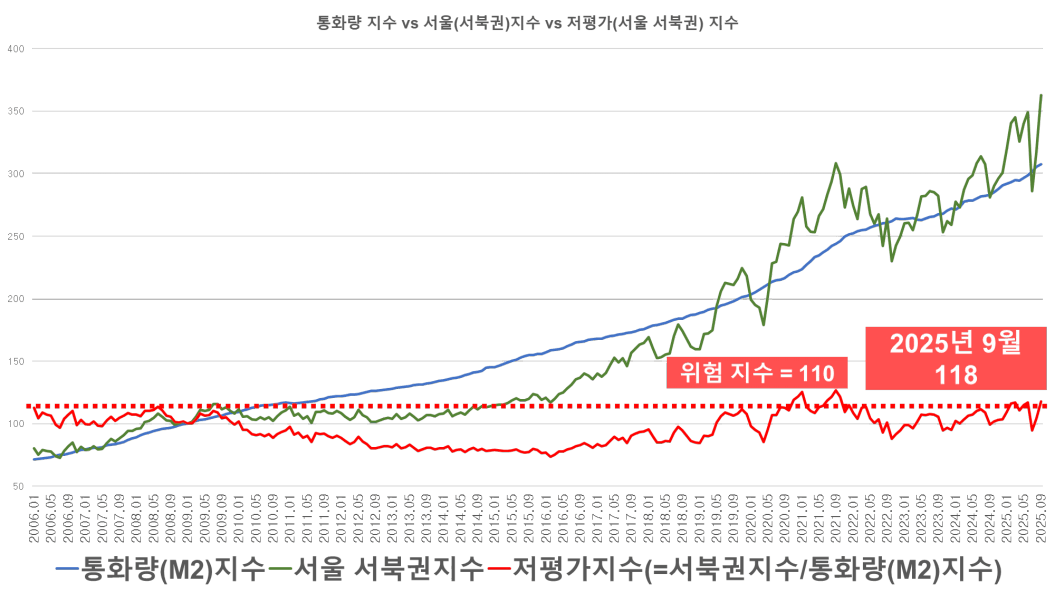 서북권의 위험지수를 110으로 설정했는데, 2025년 9월 한 달간 발생한 폭등세가 이 기준선을 순식간에 앞질러 버렸습니다.