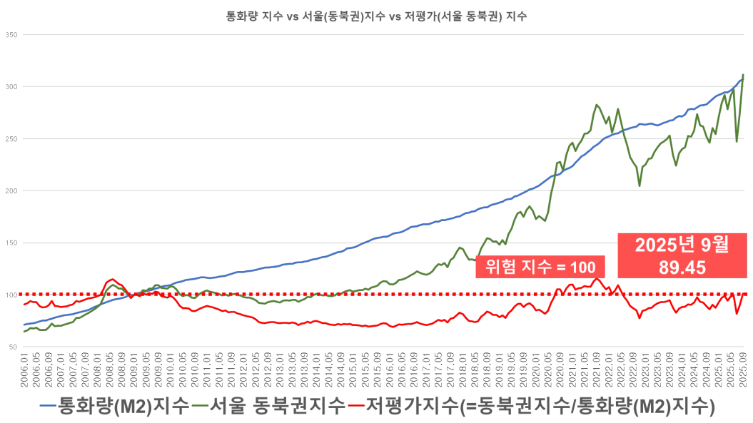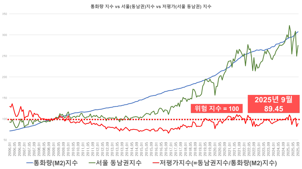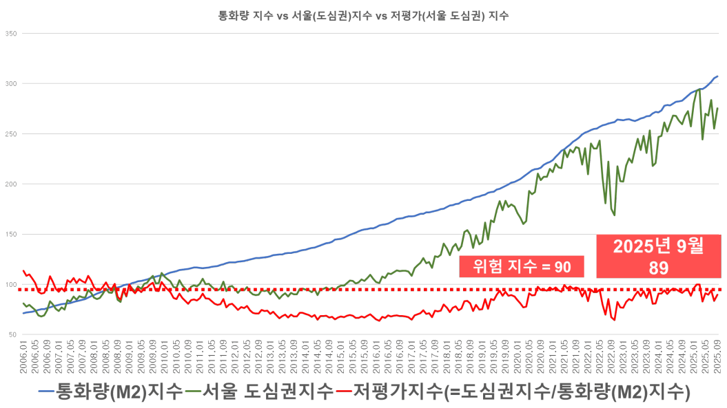 도심권의 위험지수는 90으로 설정되어 있는데 2025년 9월 기준 저평가 지수가 89까지 치솟았습니다.