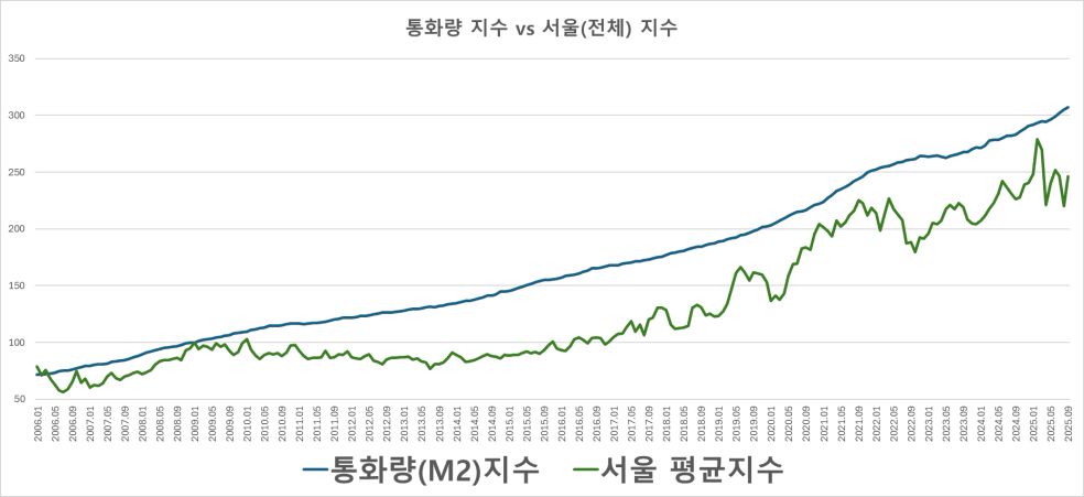 결국 핵심은 통화량과 서울 아파트 지수 사이의 ‘간극’을 읽어내는 안목입니다.
