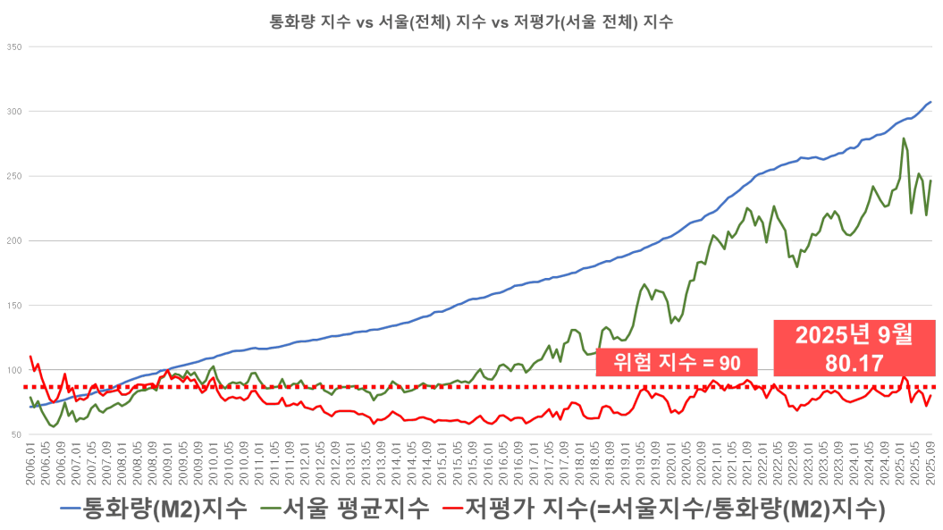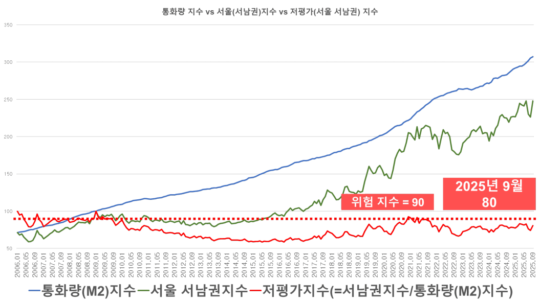 2025년 9월 서남권의 저평가 지수는 80 수준에 머물러 있습니다. 이는 아파트 가격 상승 속도가 통화량 팽창 속도의 80% 정도에 그치고 있다는 의미입니다.