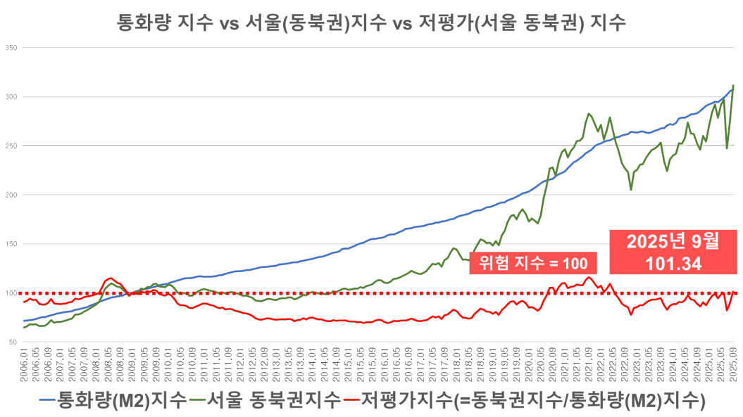 반대로 아파트 매매가의 상승 속도가 통화량의 팽창을 앞지르면 지수는 상승하며 시장의 과열을 경고합니다.