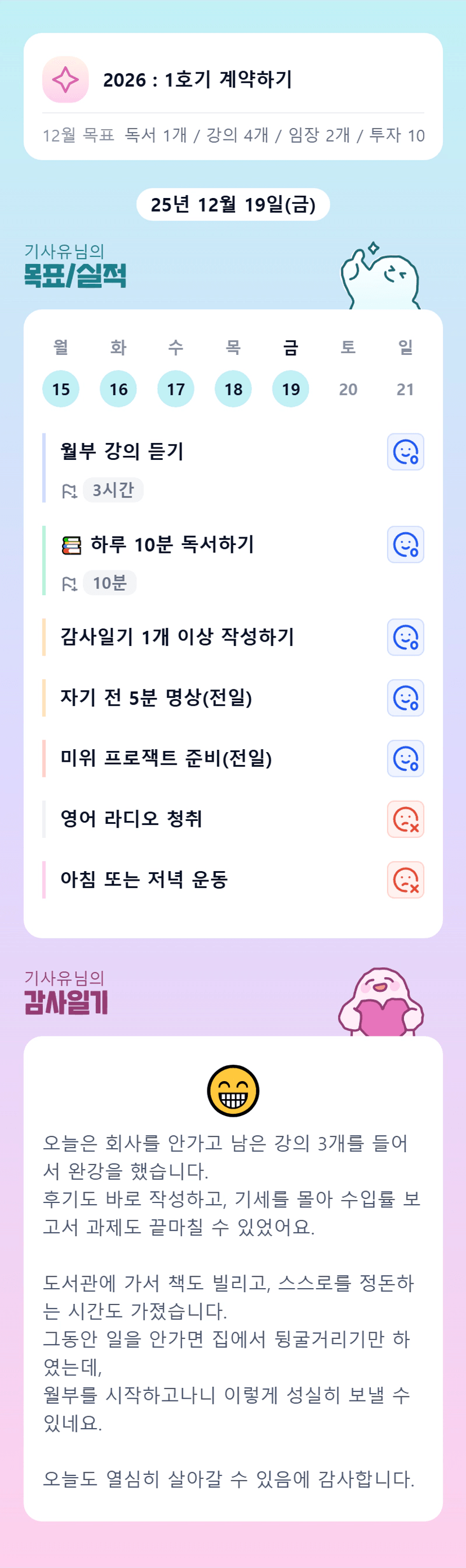 기사유님~ 완강에 과제까지 완수! 시간을 충실하게 보낸 하루 넘 멋져요^^ 내일 마지막 시험 잘 마무리하시고, 오후에 만나요♡