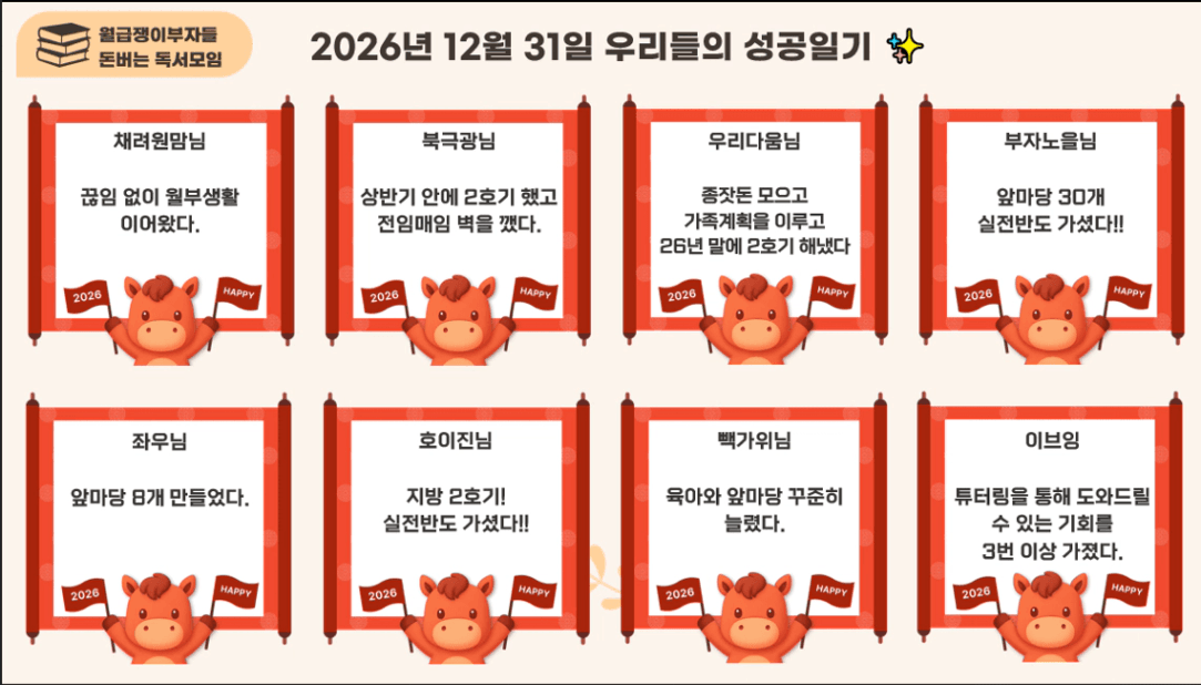 25년 12월 마지막 돈독모 모임은 이브잉님, 채려원맘님, 우리다움님, 부자노을님, 좌우님, 호이진님 그리고 빽가위님과 함께하는 소중한 시간이었습니다.