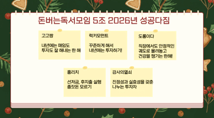 25년 마지막 돈독모를 진행했습니다. 돈독모를 10번 이상 참여했는데 이번에는 처음으로 독서리더로 선택해 보았습니다. 이번에는 월부를 시작한지 얼마 되지 않으신 분들과 진행하였고 이분들에게도 많은 것을 들으며 행복한 시간을 가졌습니다.