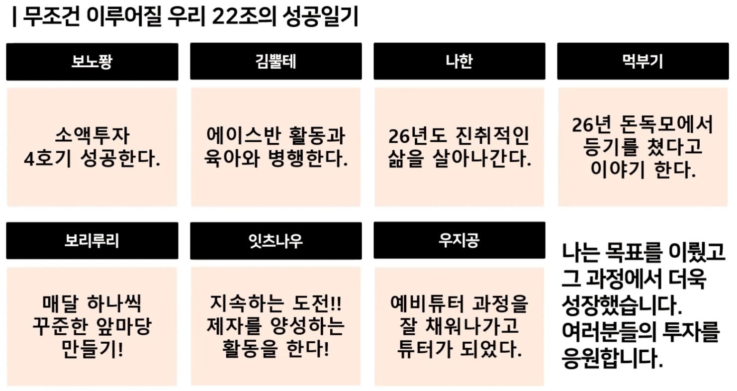 우지공튜터님 : 오늘 이렇게 다시 만나서 넘 좋았어요~시작할 때 튜터님 계셔서 넘나 놀랐습니다 ㅎㅎ 튜터님 덕분에 우리조에서 투자 3명이나 했어요~부아님은 지금 열심히 준비중이시고 ㅎㅎ 중간에 자료 만들어주신 것도 너무 좋았고, 최근에 하고 있던 고민들에 대해서도 듣고 자세히 말씀해주셔서 너무 감사했습니다! 반성할 포인트에 대해서도 다시 잡아갈 수 있었어요~삼형제분들과 함께 나란히 튜터님이 되신 모습 잠깐 상상해봤어요 ㅎㅎ 응원하고 있겠습니다! 감사해요~
