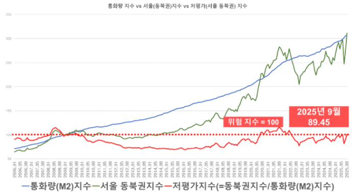 반대로 아파트 매매가의 상승 속도가 통화량의 팽창을 앞지르면 지수는 상승하며 시장의 과열을 경고합니다.