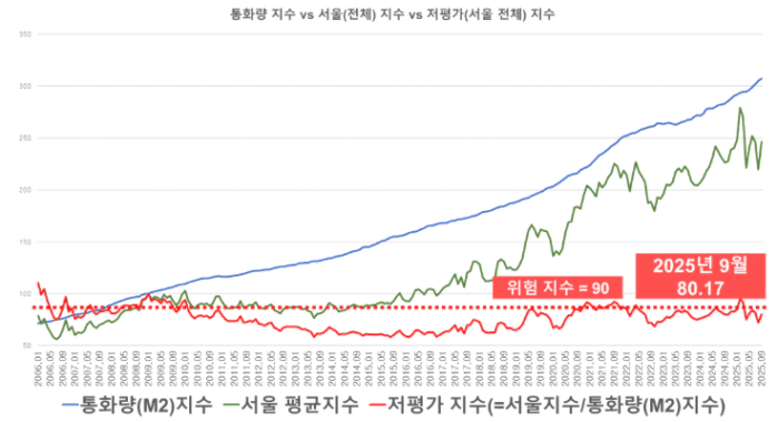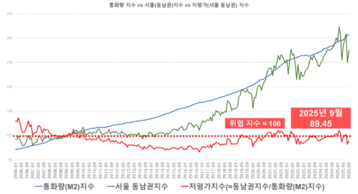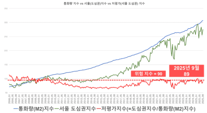 도심권의 위험지수는 90으로 설정되어 있는데 2025년 9월 기준 저평가 지수가 89까지 치솟았습니다.