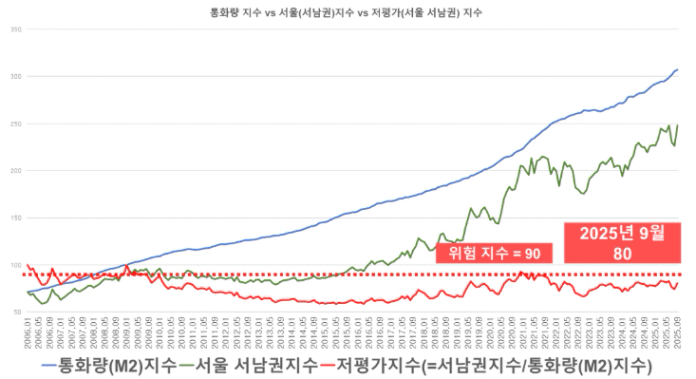 2025년 9월 서남권의 저평가 지수는 80 수준에 머물러 있습니다. 이는 아파트 가격 상승 속도가 통화량 팽창 속도의 80% 정도에 그치고 있다는 의미입니다.