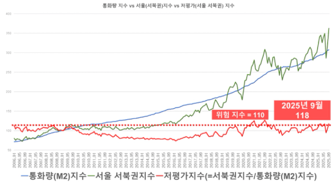 서북권의 위험지수를 110으로 설정했는데, 2025년 9월 한 달간 발생한 폭등세가 이 기준선을 순식간에 앞질러 버렸습니다.