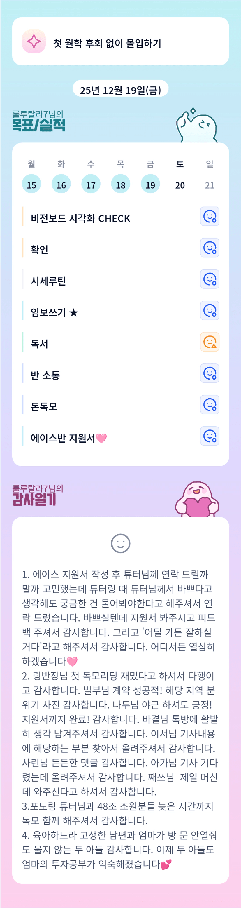 랄라님 월학에 이어 에이스반까지 도전하시는 것 멋지시네용. 고생많으셨습니다❤️