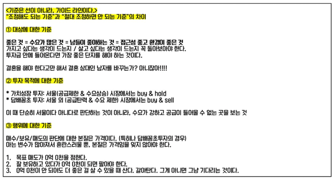 하지만, 많은 분들이 이 투자 물건은 나에게 돈을 벌게 해준 대상, 물건이라는 것에 취해서 너무 그 물건이 이뻐보여 팔기를 힘들어 하신다는 것이었습니다. 빠르게 벌었기에 빠르게 잃을 수도 있다는 것을 명심하고, 더 올라갈 여지가 있다는 것을 알고 있음에도 내가 더 좋은 자산으로 갈아타서 더 많이 벌 수 있는 곳으로 가야한다는 것을, 1억이 더 올라갈 것 같더라도, 2억이 더 오를 물건을 찾아서 바꿔 두어야 한다는 것을, 그 안에서 나의 욕심과 감정을 잘 조절하는 것이 정말 중요하겠다는 생각이 들었습니다.