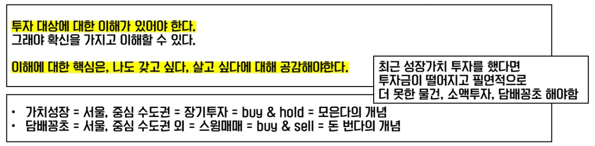 버핏이 말하는 담배꽁초 투자와 성장가치 투자에 대해 사실 처음 투자공부를 시작할 때는 명확히 구분을 하지 못했습니다. 하지만, 현재 꾸준히 투자 공부를 해나가면서, 그 차이를 구분할 수 있게 되었다는 생각이 들었습니다. 단지 수도권이라는 이유로 가치투자, 지방이라는 이유로 담배꽁초 투자를 나누는 것이 아니라, 장기적으로 보유를 할 수 있는 자산인지, 혹은 시장의 흐름에 따라서 내가 돈을 불리는 목적으로 쓸 수 있는지, 이 투자를 하기 전 나의 목적을 명확히 돌아보고 대상을 판단하는 것이 우선이라는 생각이 들었습니다.