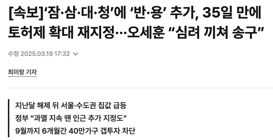오세훈 서울시장이 기존에 토허제로 묶여있던 잠실, 삼성, 대치, 청담을 풀었습니다