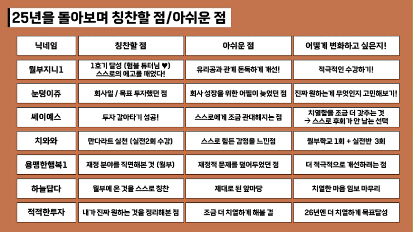 25년 돌아보며 칭찬할점과 아쉬운점을 나눴는데요,