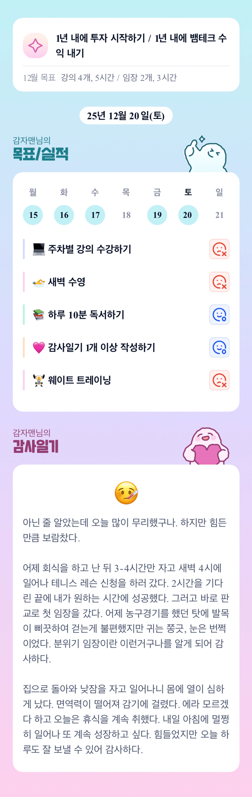 에고 ㅠㅠㅠ 감자님.. 오늘 너무 고생하셨어요ㅠㅠ 약 잘챙겨드시고 일요일은 푹 쉬세요ㅠㅠ 오늘 더 쉬엄쉬엄했어야했는데..😭