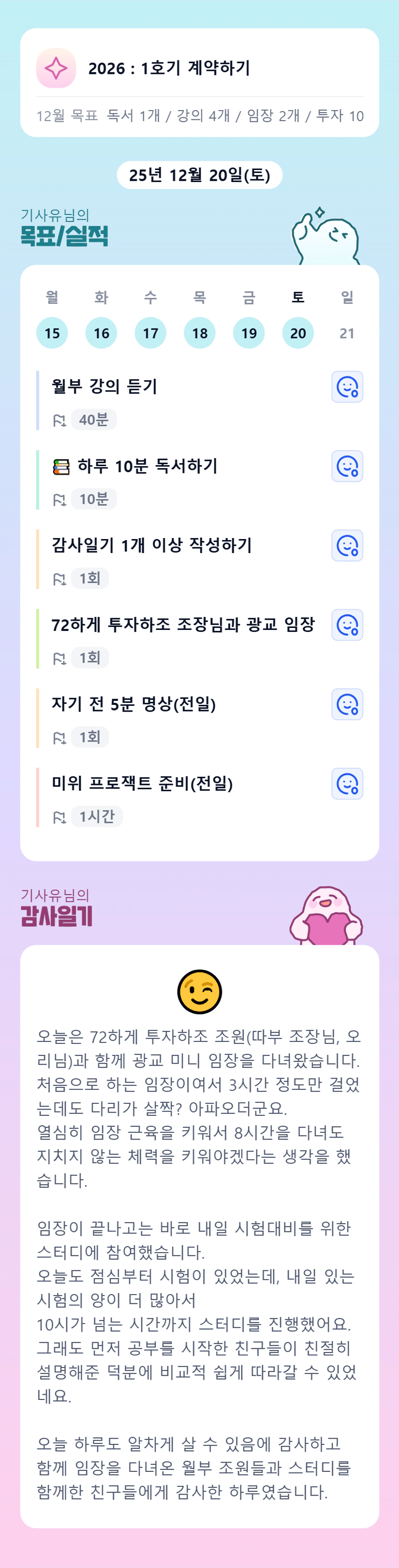 기사유님~ 어제 임장 다리 아프셨군요ㅠ 제가 미처 헤아리지 못했어요. 다들 너무 잘 걸으셔서, 거뜬히 해내시고 있는 줄..힘든 내색 없이 끝까지 함께 해주셔서 감사해요♡ 오늘 드디어 마지막 시험인데, 잘 마무리하시고 지금처럼 1호기를 향해 열심히 달리시길 응원드려요^^