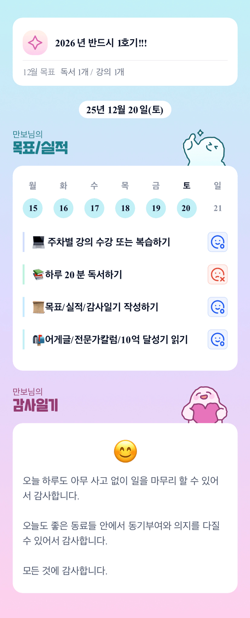 만보님, 저도 만보님과 같은 조임에 늘 감사하고 있습니다. ㅎㅎㅎ 오늘 하루도 고생 많으셨어요! 월요일에 조모임에서 뵙겠습니다.