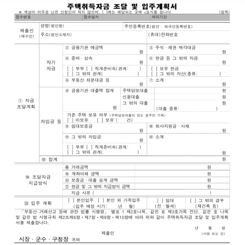 자금조달계획서는 토지거래허가 절차를 거치거나, 매매계약서 작성 이후 부동산 거래신고 단계에서 반드시 함께 준비해야 하는 핵심 서류입니다.