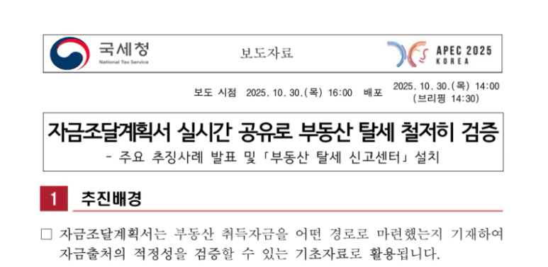 국세청은 공유된 자금조달계획서를 이미 보유하고 있는 소득·재산 자료와 연계해 분석하고, 그 과정에서 탈루 혐의가 발견되면 자금출처조사 대상자로 선정하겠다는 방침입니다.