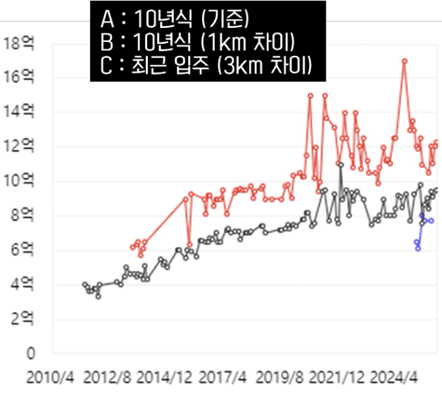 위 예시들을 통해 [ 신축 전세가 >> 구축 전세가 ]