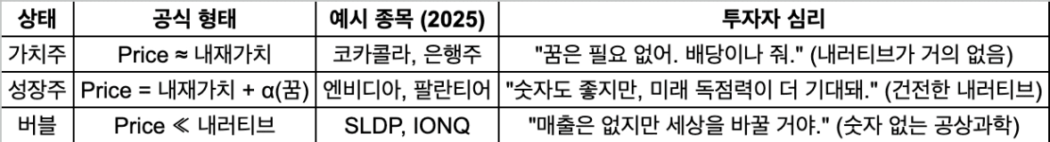 앞서 밝힌 공식"주가 = 내재가치 + 내러티브"에 따라, 주가 안에서 내재가치와 내러티브가 차지하는 비중에 따라 주식은 크게 세 가지 유형으로 분류됩니다.