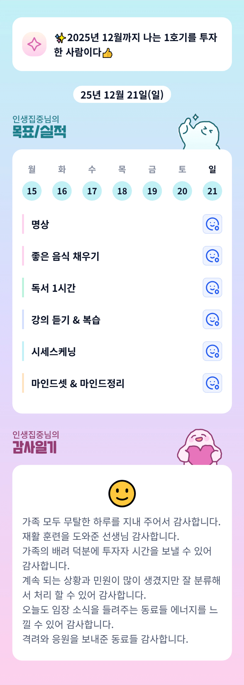 집중님 매일매일 꾸준히 넘넘 대단하십니다! 건강 잘 지키시면서 나아가봐요. 팟팅입니다!!!