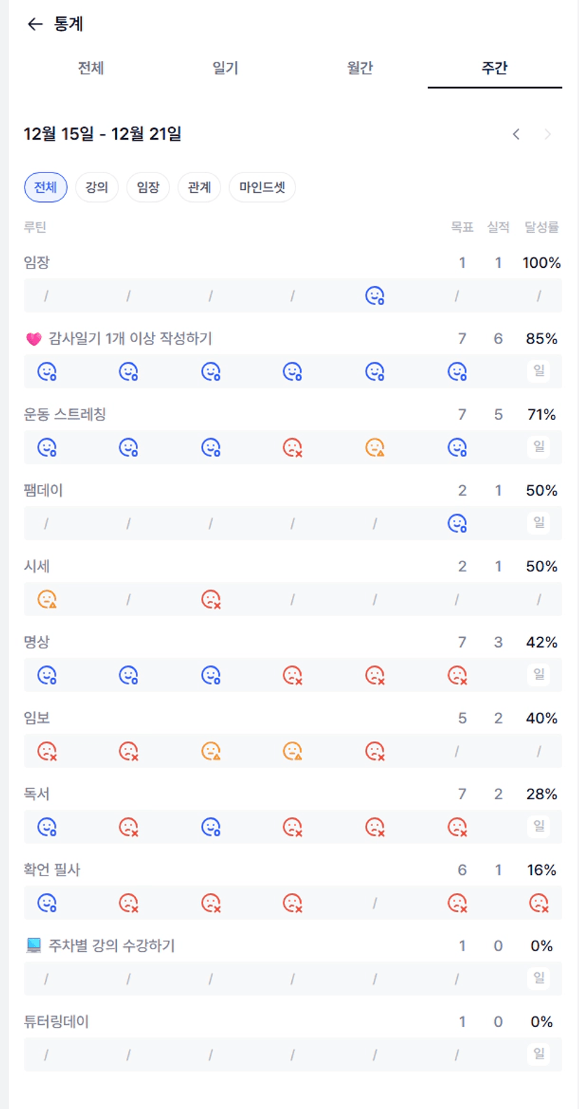 1️⃣ 목실감 - 통계 - 주간으로 들어가 이번주 나의 목실감 현황을 인증해주세요 ! :)