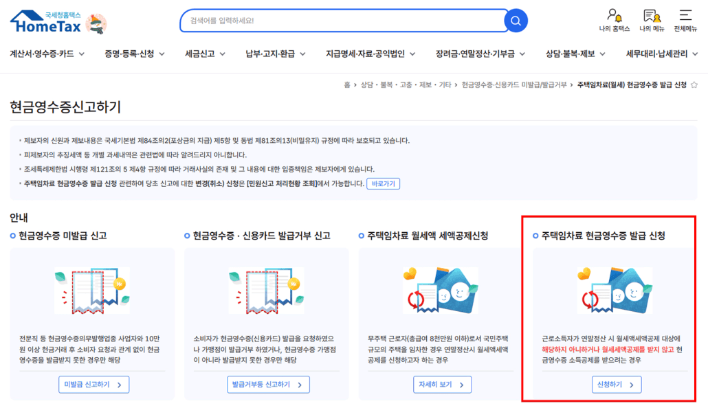 홈텍스에 들어가셔서 ‘주택임차료 현금영수증’이라고 검색하면