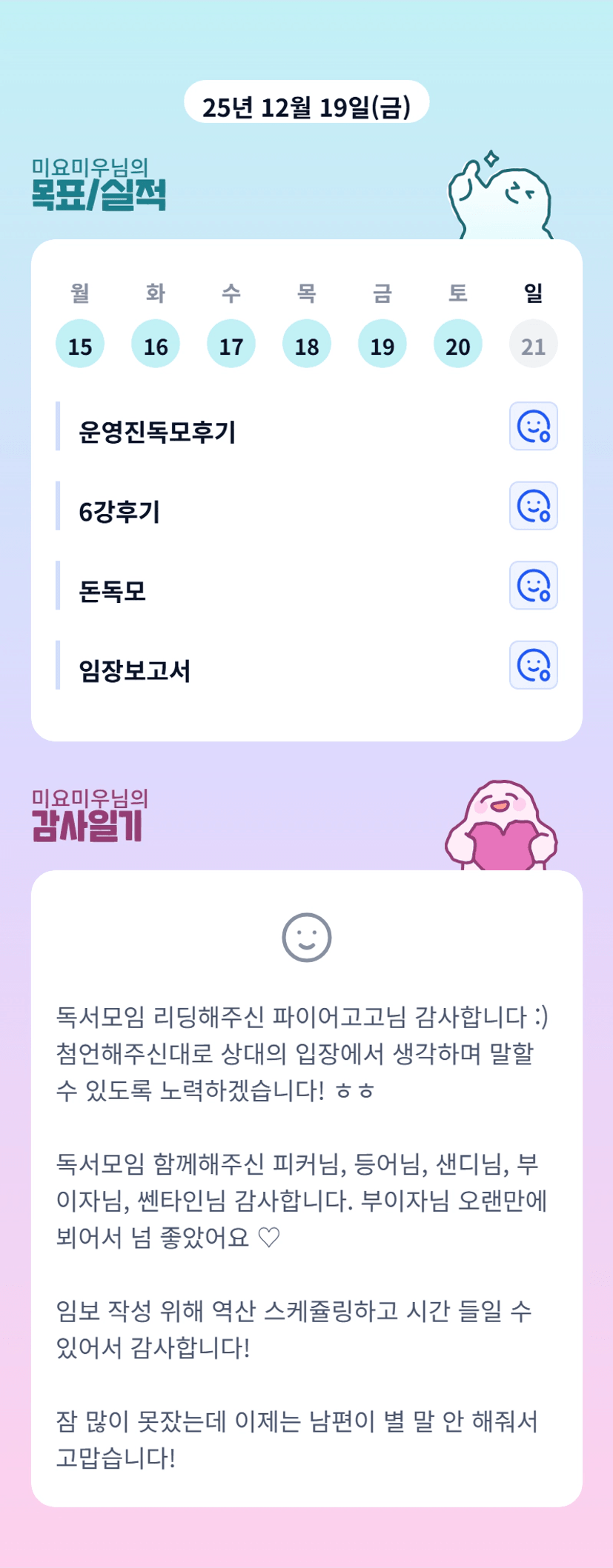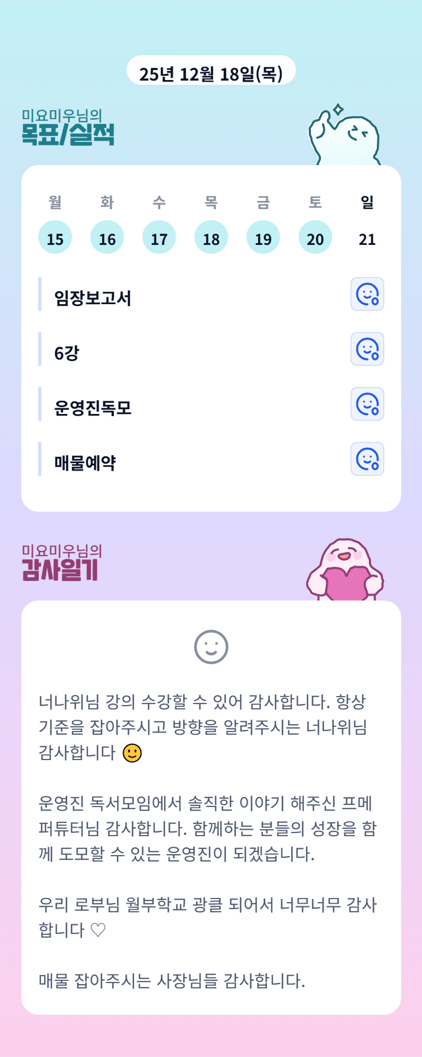 미요미우튜터님 🥰 저도 넘 넘.. 반가웠어요!! 튜터님 ! 주말도 고생많으셨습니다! 오늘도 화이팅입니다🩷