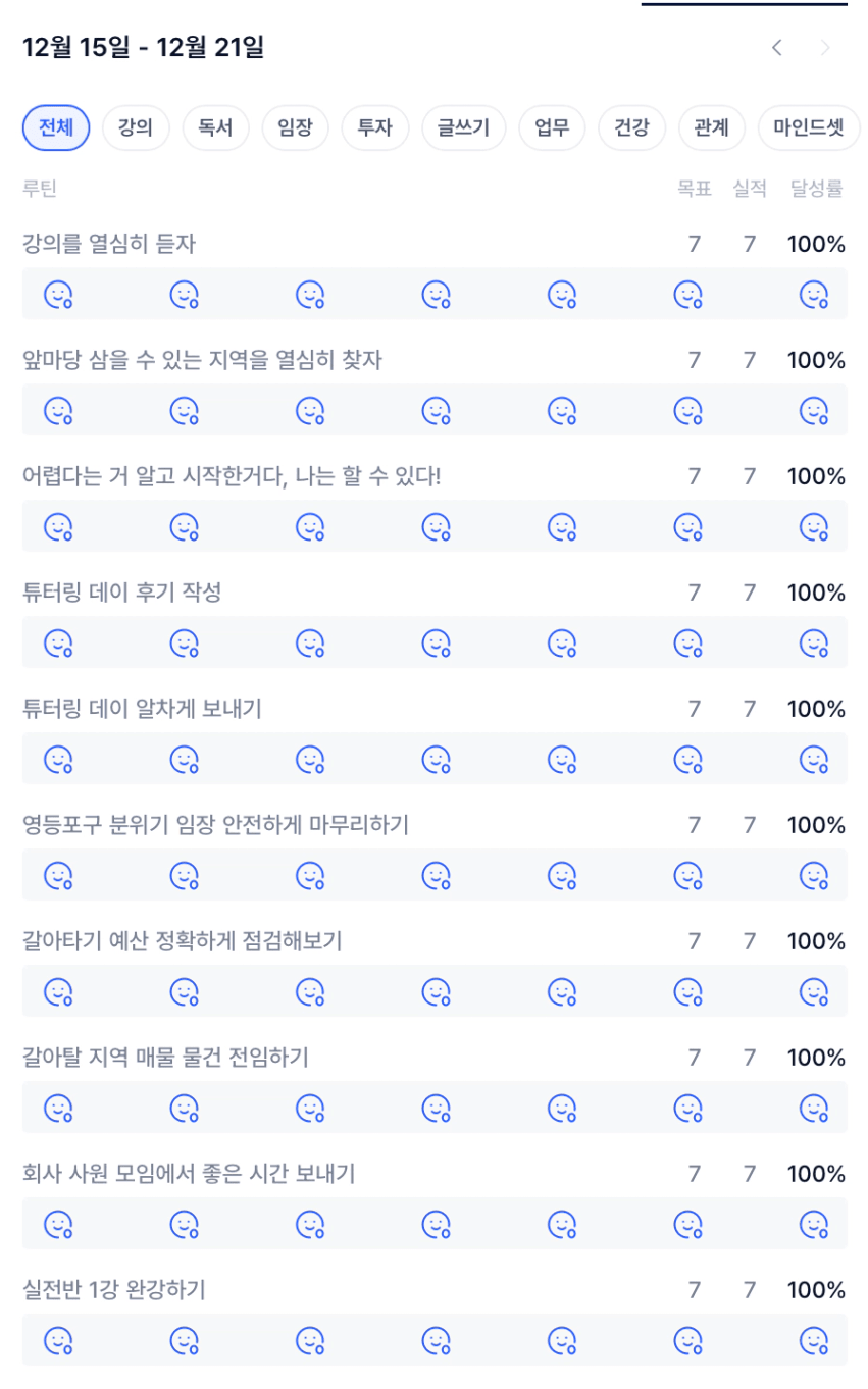 이번 주는 하루 하루 달라지는 상황과 다양한 이벤트들로 변화가 많았던 한 주였다. 그런 와중에 목실감을 작성하는 것이 하루를 돌아보고, 지금의 나를 점검하고, 가고자하는 큰 방향성을 지켜갈 수 있는 계기가 됐다.