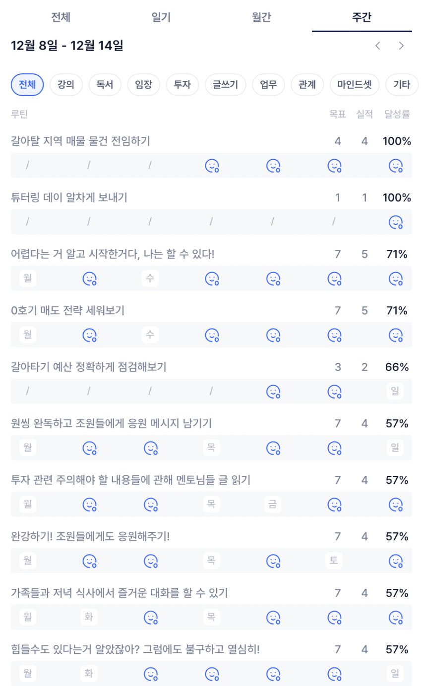 하지만, 지난 달, 그리고 지난 주보다 집중해야 할 것을 줄이고 몰두할 수 있는 환경을 조성해서 그 길로 가고자하는 명확한 방향성을 잡았다는 것에 감사하다고 생각하고 그런 와중에 스스로가 느끼는 매일의 중요한 덕목들을 지키고자 노력할 수 있어서 좋았다.