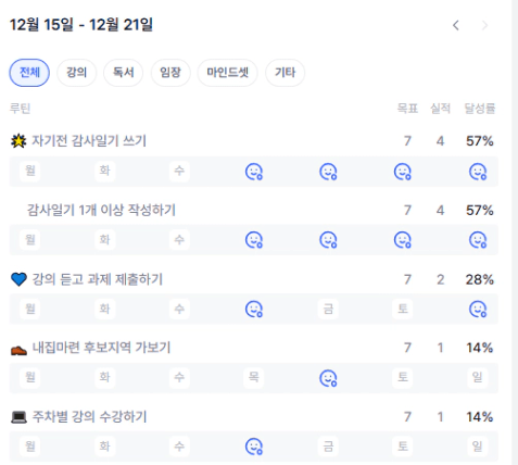 많은 도움이 된것 같다. 또한 데일리로 해야될일을 체크 하고 할수 있다는 다짐도 할수 있어서 큰 도움이 되었다.
