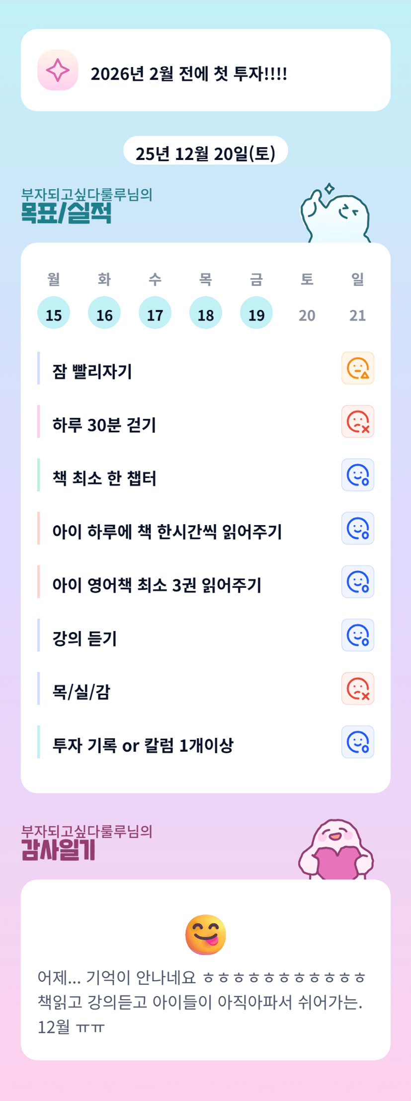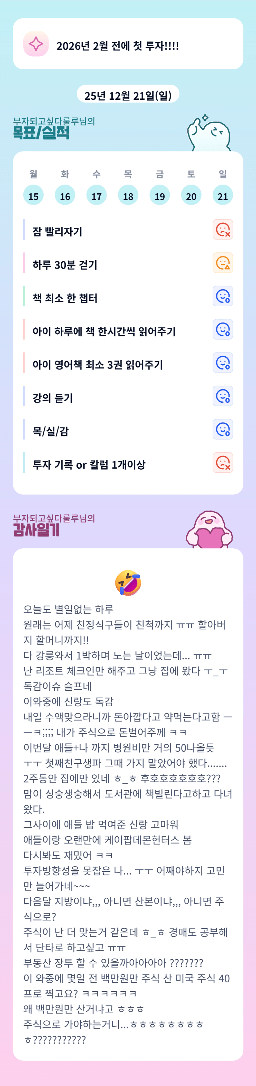 아니 남편까지 독감! 저라면 주식 잘되었으면 부동산으로 안넘어 왔을 수도 있어요. 강의에서도 뭐든 잘하는거 하면 된다고. 근데 조장님은 주식도 굿 부동산도 굿 일것 같아서 고민되네요.! 계속 부동산 호가 뛰니 저도 미칠지경.
