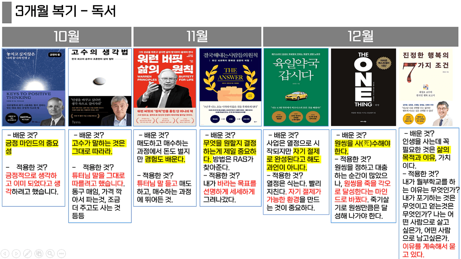 내가 어떻게 버티고 성장했지? 돌아보면 100% 환경덕분이었습니다. 강의를 들었고, 조장을 신청했고, 실전반이 되면 몰입했고, 월학에서도 후회없이 몰입했습니다. 돈독모를 신청해서 1권 더 읽었고, 커피쏘기 내기를 걸어서 확언을 쓰고, 과제를 했습니다.