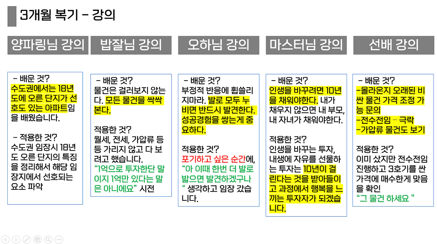 : 인생을 바꾸는 투자는 10년이 걸린다는 것을 배웠습니다. 내가 안하면 우리 가족이, 내 자녀가 해야된다는 것을요. 저는 제 생에 인생을 바꾸는 투자라는 놀라운 경험을 누리겠습니다. 제가 태어난 이유를 과정에서 만끽하고 행복하겠습니다.