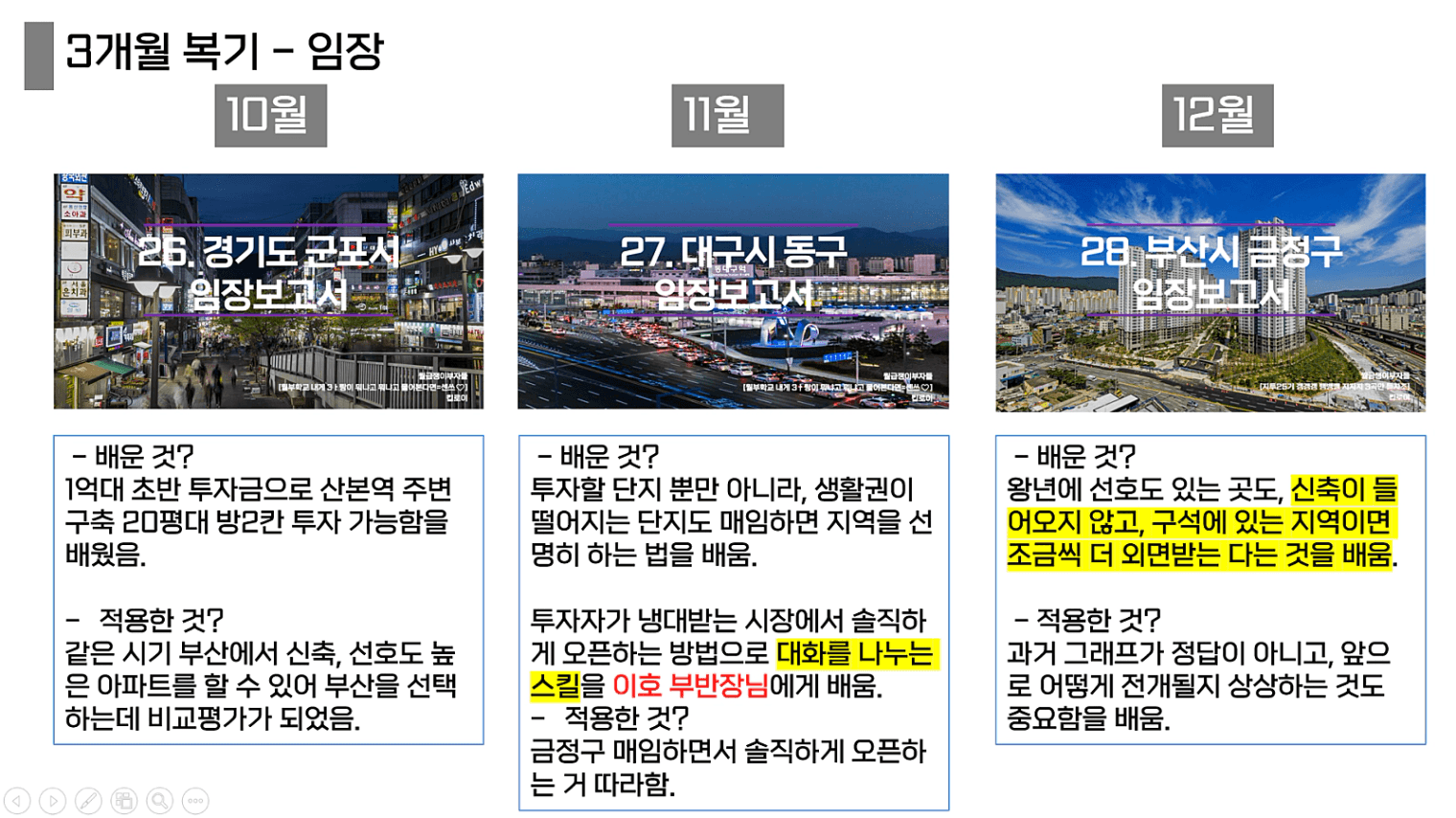 : 부산 다음으로 기회를 줄 대구 시장에 대해서 알 수 있었습니다. 개인적으로는 이호 부반장님과 함께하며 매임 스킬을 배울 수 있었구요. 향후 대구에 기회가 올때, 수성구 - 중구 - 동구 금호강 왼쪽 - 북구 금호강 아래 - 달서구를 비교해서 가장 최선을 물건을 뽑을 수 있음을 배웠습니다.