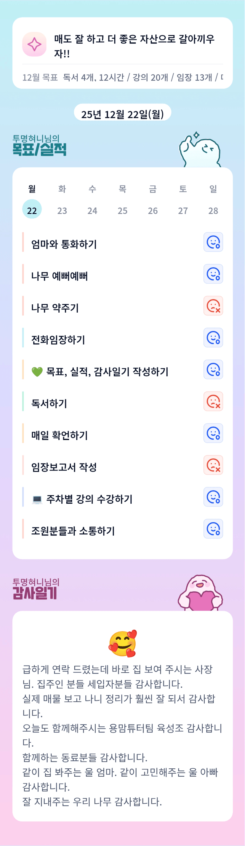 오늘도 너무 수고 많이 하셨어요. 컨디션 조절 잘 하시면서 이번 한 주도 행복한 한주 되세요^^