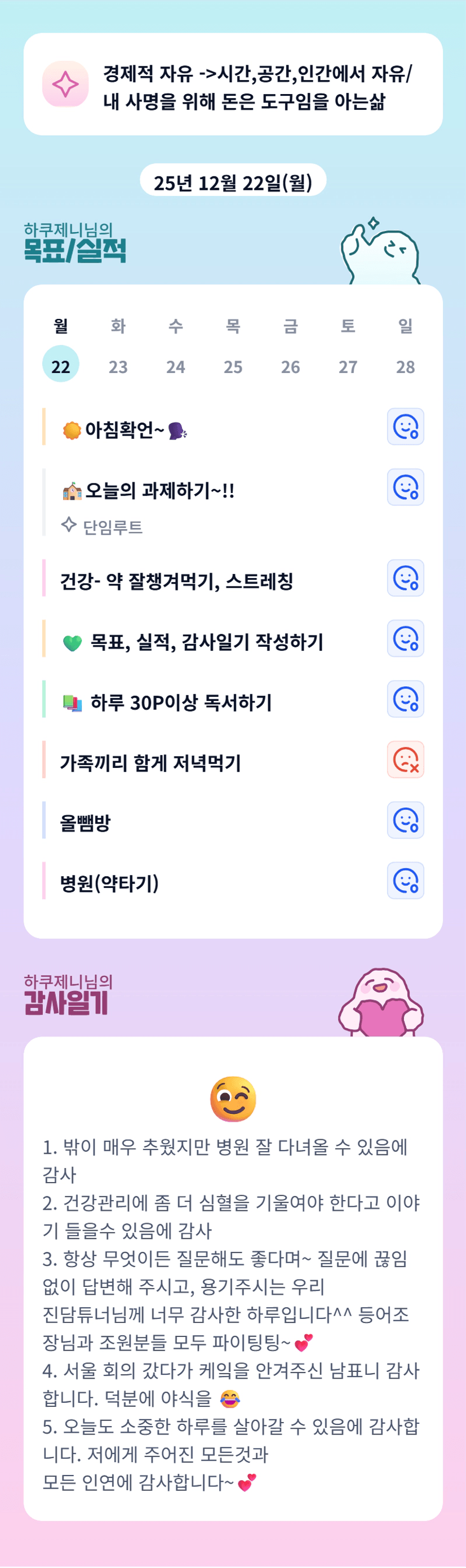 제니님 오늘도 수고 많이 하셨습니다. 우리 진짜로 26년에는 건강해져봅시다 화이팅 !!