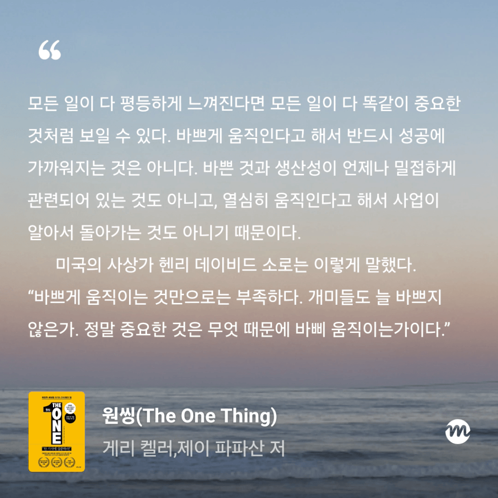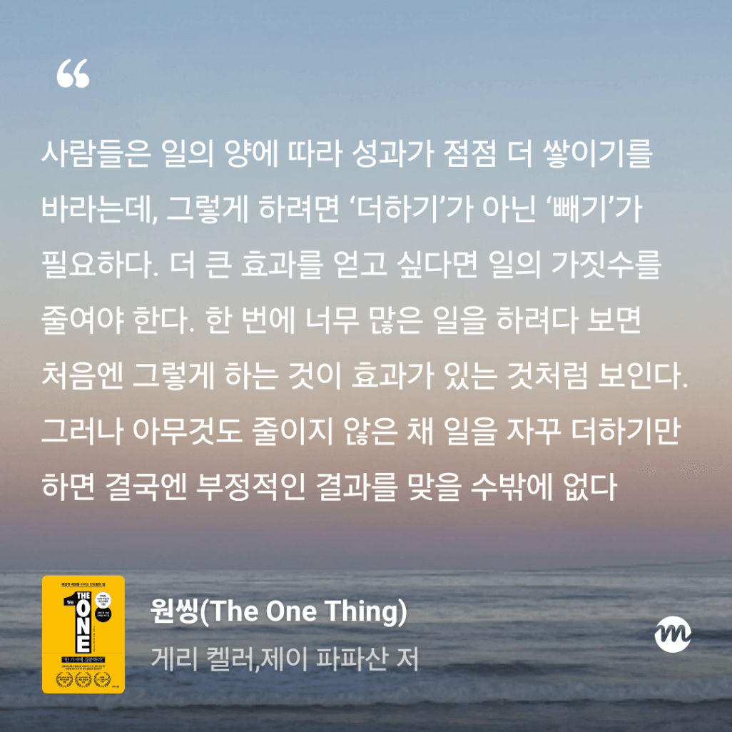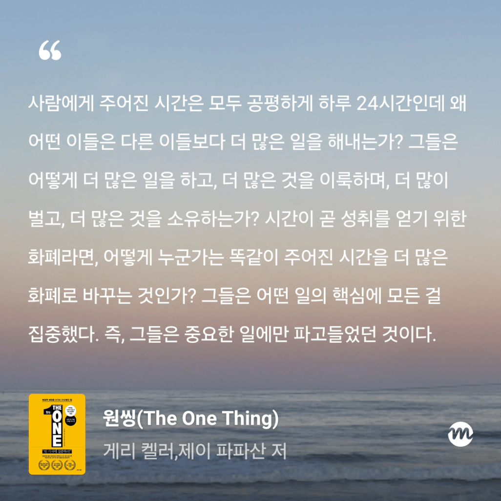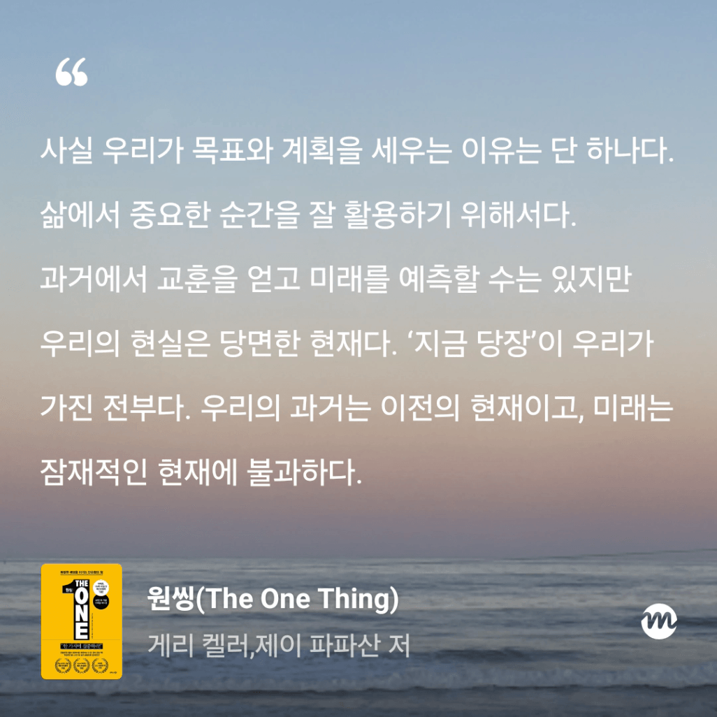 : 올해만 3번째 읽는 원씽. 10번은 읽은 것 같은데, 읽을 때마다 참 다르게 다가오는 책이다.