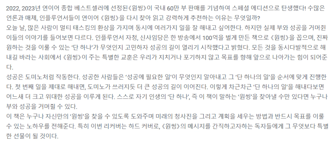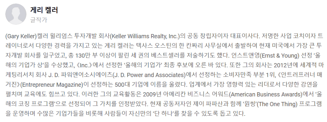 책 제목(책 제목 + 저자) : 원씽 + 게리 켈러, 제이 파파산