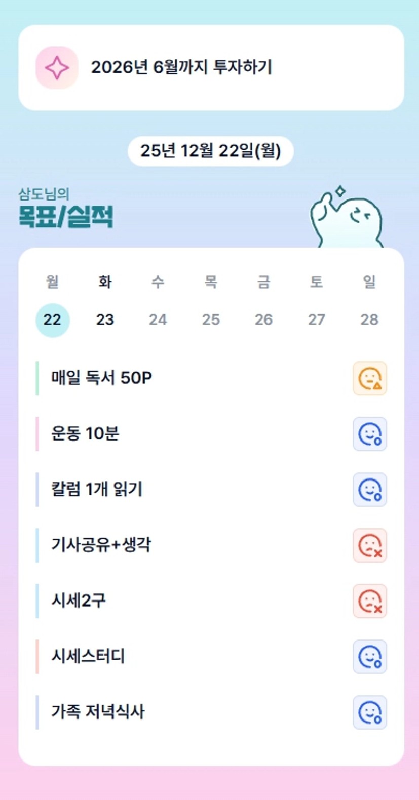 2. 퇴근 후 가족과 함께 저녁 먹을 수 있음에 감사합니다. 아이들과 즐겁게 놀다가 급발진으로 화내고 크게 혼내서 미안합니다. 냥이도 혼내고 괴롭혀서 미안합니다. 왜인지 모르는 마음속의 불안함, 교만한, 부정적인 마음이 가득차 있다는 걸 알게되었습니다. 그럼에도, 사과할 수 있었던 용기에 감사합니다. 이번 연말에는 아이들과 더 많은 시간 보내며 관계를 형성해 나가도록 하겠습니다.