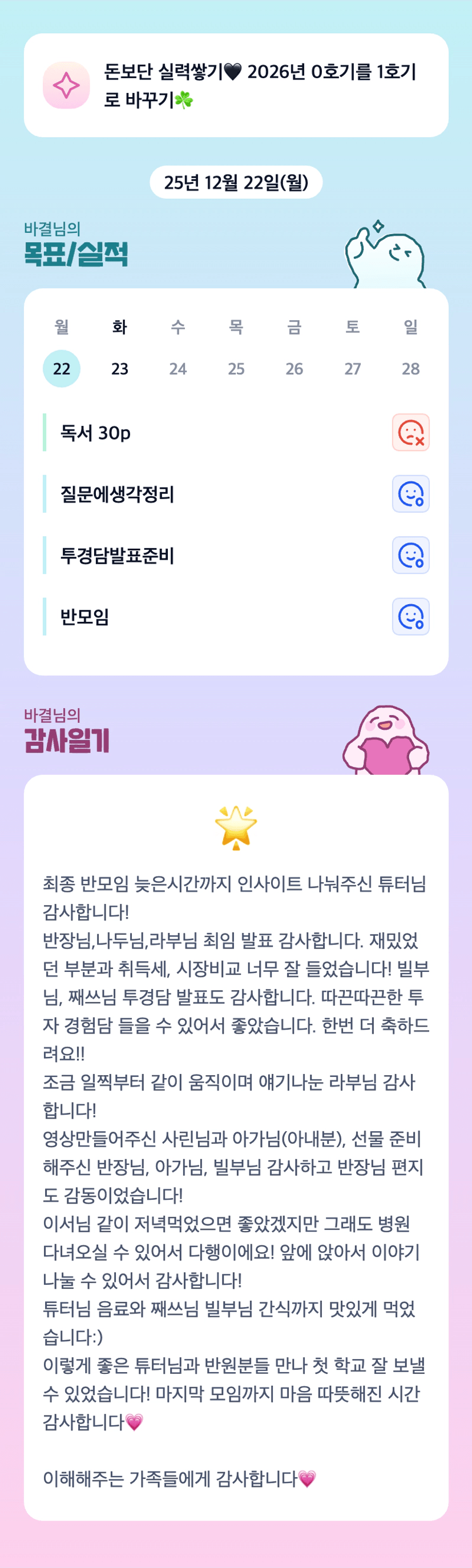바결니니님💕 투경험 듣고 바결님이 진짜 멋지신 분이라는 생각이 한 번 더 들었고 더욱 응원하고 싶어졌어요.