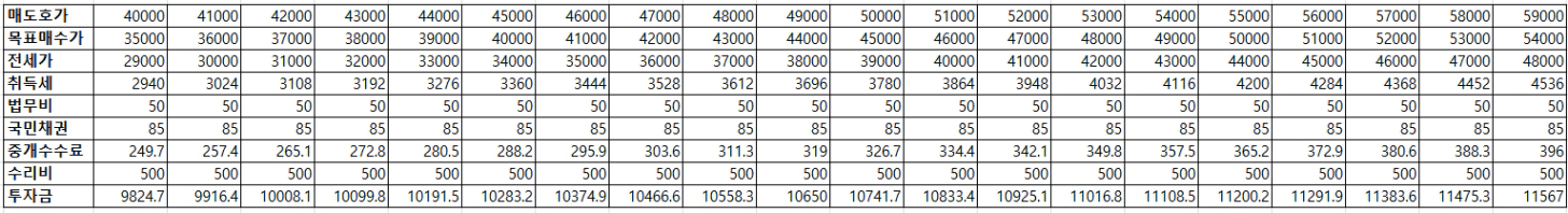 저는 위와 같은 표를 통해 매전차가 6천만원 정도 차이가 나면 투자를 해 볼 수 있겠다는 계산이 섰고,